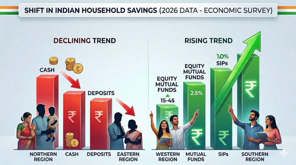 So, what’s the real story? Is the traditional Indian love affair with cash, gold, and fixed deposits finally fading? The Economic Survey 2025-26, tabled just before Budget 2026, has dropped a bombshell: Indian households are quietly but dramatically shifting their savings away from cash, bank deposits, and even gold toward shares, mutual funds, and pension plans. This isn’t a fleeting trend—it’s a structural reset in how we build wealth. In this blog, we’ll unpack the data, explore the “why” behind this cash-to-equity revolution, weigh the risks and rewards, share real Indian stories, and give you a practical blueprint to rebalance your own portfolio. Whether you’re a college student just starting out or a mid-career parent juggling EMIs, this shift could be your ticket to smarter money moves in 2026 and beyond.