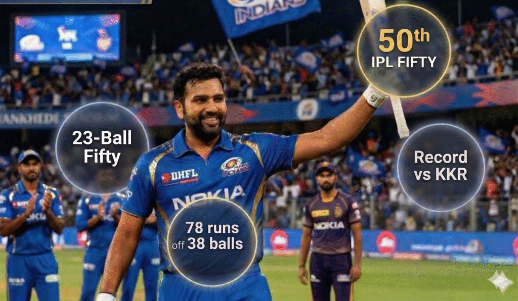 Rohit’s 78 wasn’t just personal glory; it rewrote the IPL record books. He became the highest run-scorer against a single opponent in IPL history, amassing 1,161 runs against KKR—pipping Virat Kohli’s 1,159 against Punjab Kings. It was his 50th IPL fifty, joining an elite club. And that 23-ball fifty? Pure history.