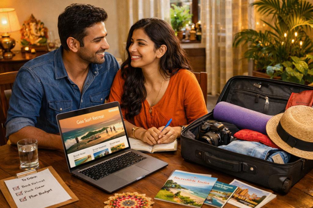 - Surfing & Adventure – Goa/Andaman: Ride waves, ride stress away. Ideal for 25-35 crowd seeking adrenaline reset.