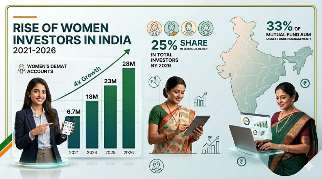 For generations, Indian women were taught to save, not invest. Gold bangles, fixed deposits, and recurring deposits felt “safe.” But 2026 looks very different. According to recent National Stock Exchange (NSE) data, women now make up nearly 25% of all individual investors—around 31 million strong as of late 2025, out of a total investor base exceeding 12.7 crore. That’s a massive jump from just 22.8% a couple of years ago. Demat accounts held by women have exploded from 6.7 million in 2021 to over 27-28 million by early 2026—a more than 4x surge.